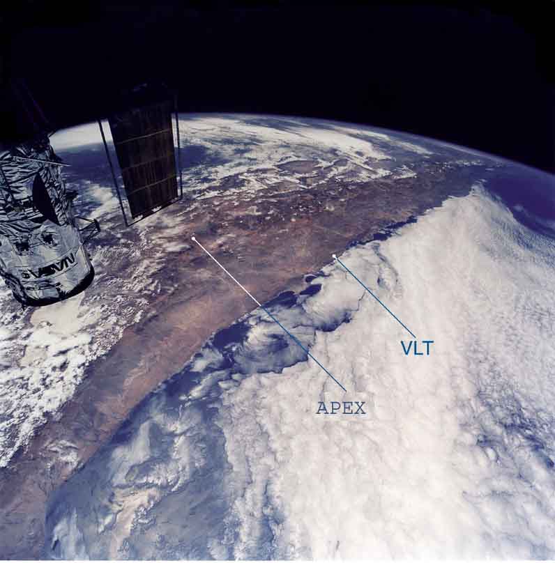 Esta espectacular fotografía tomada desde el espacio muestra la costa norte Chilena, marcando la dirección Norte – Sur desde el borde inferor izquierdo al superior derecho de la imagen. Nótese cómo el manto nuboso sobre el Pacífico literalmente se corta en el borde costero, debido a la corriente fría de Humboldt y a la Cordillera de la Costa del lugar. El otro borde que delimita el territorio chileno, la Cordillera de Los Andes, oficia como un muro que para los frentes húmedos provenientes del Atlántico. El resultado, es un territorio extremadamente seco de cielos despejados, el desierto de Atacama, con condciones excepcionales para la observación astronómica en el rango óptico y en el infrarrojo. Obsérvense las posiciones de Cerro Paranal, donde se encuentra el VLT próximo a Cerro Armazones, y de APEX en el Llano Chajnantor a 5100 metros de altura, donde junto a él hoy se encuentra el complejo de radiotelescopios ALMA. Crédito de la imagen: NASA. Más información. Vea otra fotografía del mismo lugar, tomada por el astronauta Reid Weiseman en el 2014 desde la ISS.
