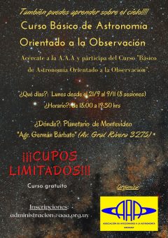 La Asamblea General Ordinaria, está fijada para el: viernes 26 de junio a las 19:00hs el primer llamado y 19:30hs el segundo llamado. La Asamblea se llevará a cabo en la sala Galileo del Planetario de Montevideo, será obligatorio el uso de tapaboca, y se mantendrá la distancia entre los asistentes que es obligatoria para las actividades bajo techo. El orden del día, será el siguiente: 1) Memoria. 2) Balance. 3) Consideración de lo actuado desde el 1º de abril a la fecha 4) Costo de cuota social 5) Proclamación de nuevas autoridades. Los esperamos. Secretaría A.A.A.