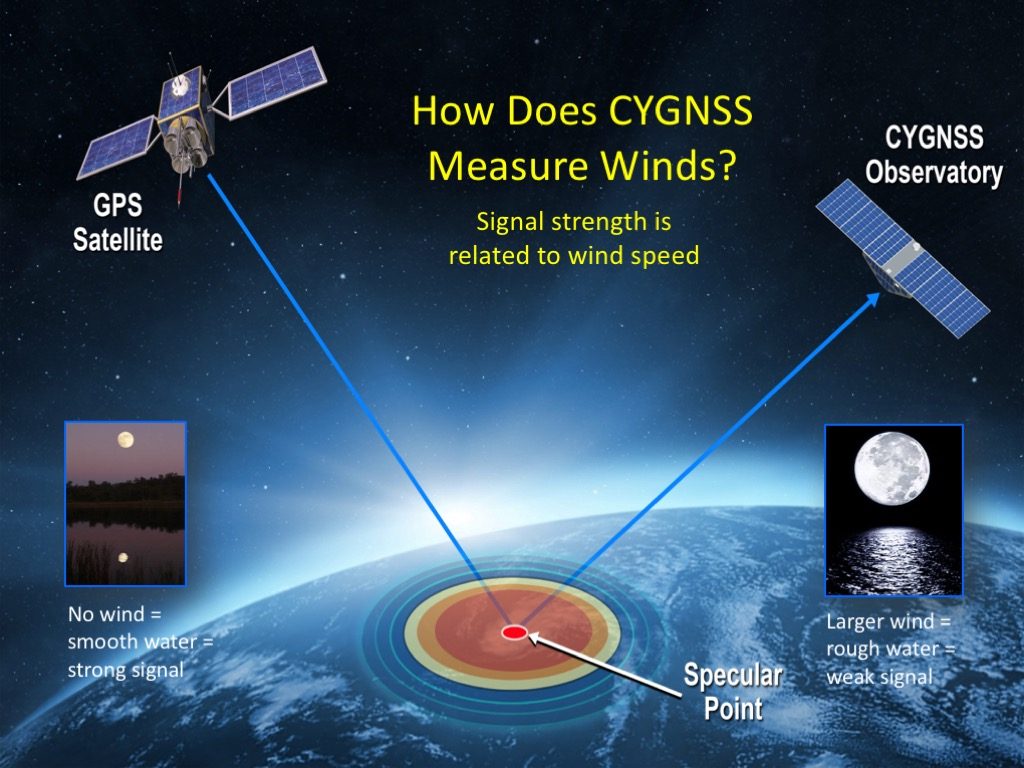 ¿Cómo mide CYGNSS los vientos? La intensidad de la señal está relacionada a la velocidad del viento: cuando no hay viento y la superficie del océano está calma la intensidad de la señal es fuerte, disminuyendo a medida que la superficie se vuelve más “rugosa” cuando aumenta la velcidad del viento. Crédito: NASA.