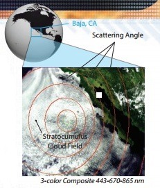 A la izquierda una foto de las nubes sobre Baja California, Compuesta a partir de imágnes tomadas con 3 filtros y a la derecha la misma escena en luz polarizada. De esa forma trabaja HARP. Crédito: Space Dynamic Laboratory, Utah State University.