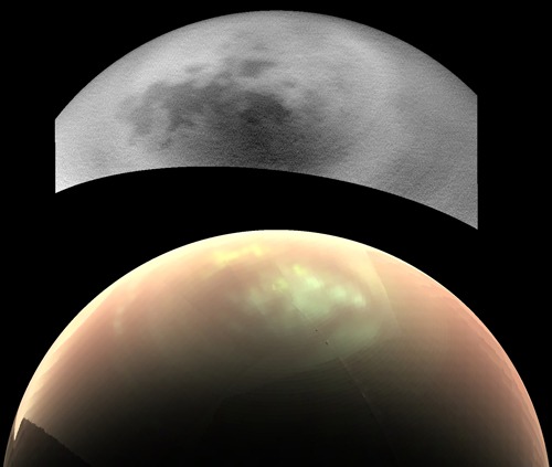 Región del hemisferio norte de Titán; la imagen está formada por las fotos de dos cámaras a bordo de la nave espacial Cassini y muestran que un instrumento puede ver las nubes mientras que el otro no . (Arriba) Una visión desde la cámara ISS, tomada el 8 de Junio del 2016, muestra cielos relativamente libres de nubes. (Parte inferior) Una imagen de la misma región, tomada un día antes por la cámara VIMS, muestra un gran campo claro (amarillo) de nubes. Crédito: NASA / JPL-Caltech / SSI / Univ. Arizona / Univ. Idaho
