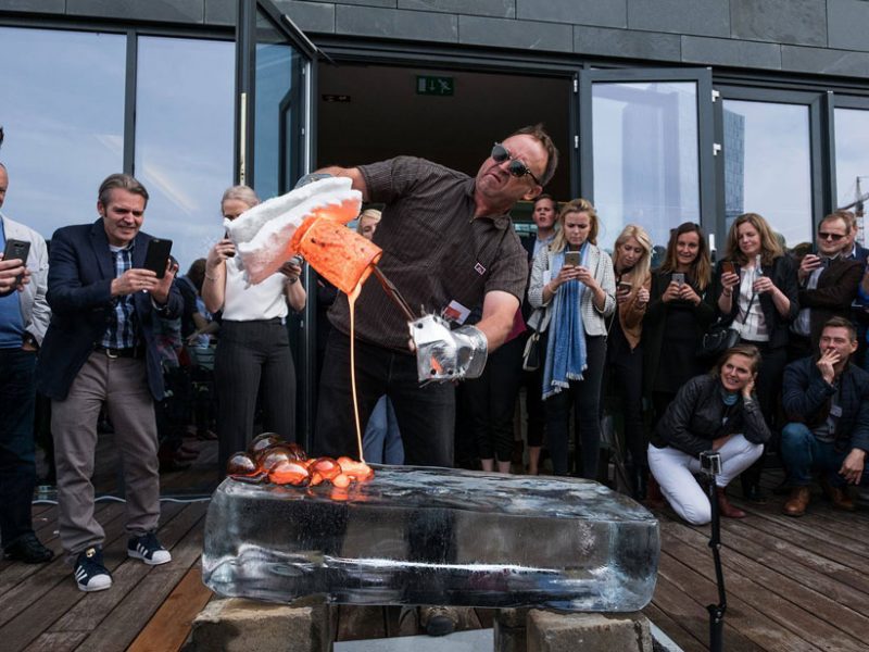 El artista Bob Wysocki vierte lava basáltica hecha en casa, sobre hielo en una demostración en Reykjavik, Islandia. El vapor liberado del hielo por el calentamiento repentino infla burbujas en la lava que toman forma de cáscaras de vidrio cuando la lava se enfría. Crédito: Syracuse Lava Project, Syracuse Univsersity. Lea el artículo completo.