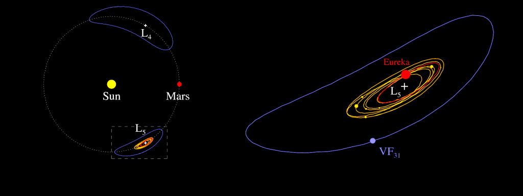 Los troyanos de Marte comparten la misma órbita que el Planeta Rojo, pero siempre se mantienen 60 ° por delante o por detrás, en los llamados cuarto y quinto puntos de Lagrange (L4 y L5; ver figura). Allí, los asteroides orbitan el planeta a la misma velocidad que orbitan el Sol. Como resultado, las órbitas de los asteroides se estabilizan mediante interacciones gravitacionales tanto con el Sol como con el planeta. Los asteroides Troyanos están más comúnmente asociados con Júpiter, que tiene más de 6000. Entre los planetas interiores, sólo Marte posee Troyanos, 10 de ellos, con el más grande que mide alrededor de 2 kilómetros de diámetro.
