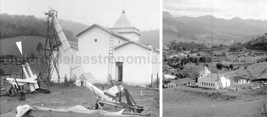 La comitiva del Observatorio Nacional Argentino (ONA) en Cristina, Brasil, dispuesta para la observación del eclipse total de Sol del 10 de Octubre de 1912. Señaladas, las astrocámaras destinadas a las observaciones para verificar la Teoría de la Relatividad. A la derecha vista del entorno (Archivo OAC, identificación y digitalización S. Paolantonio).